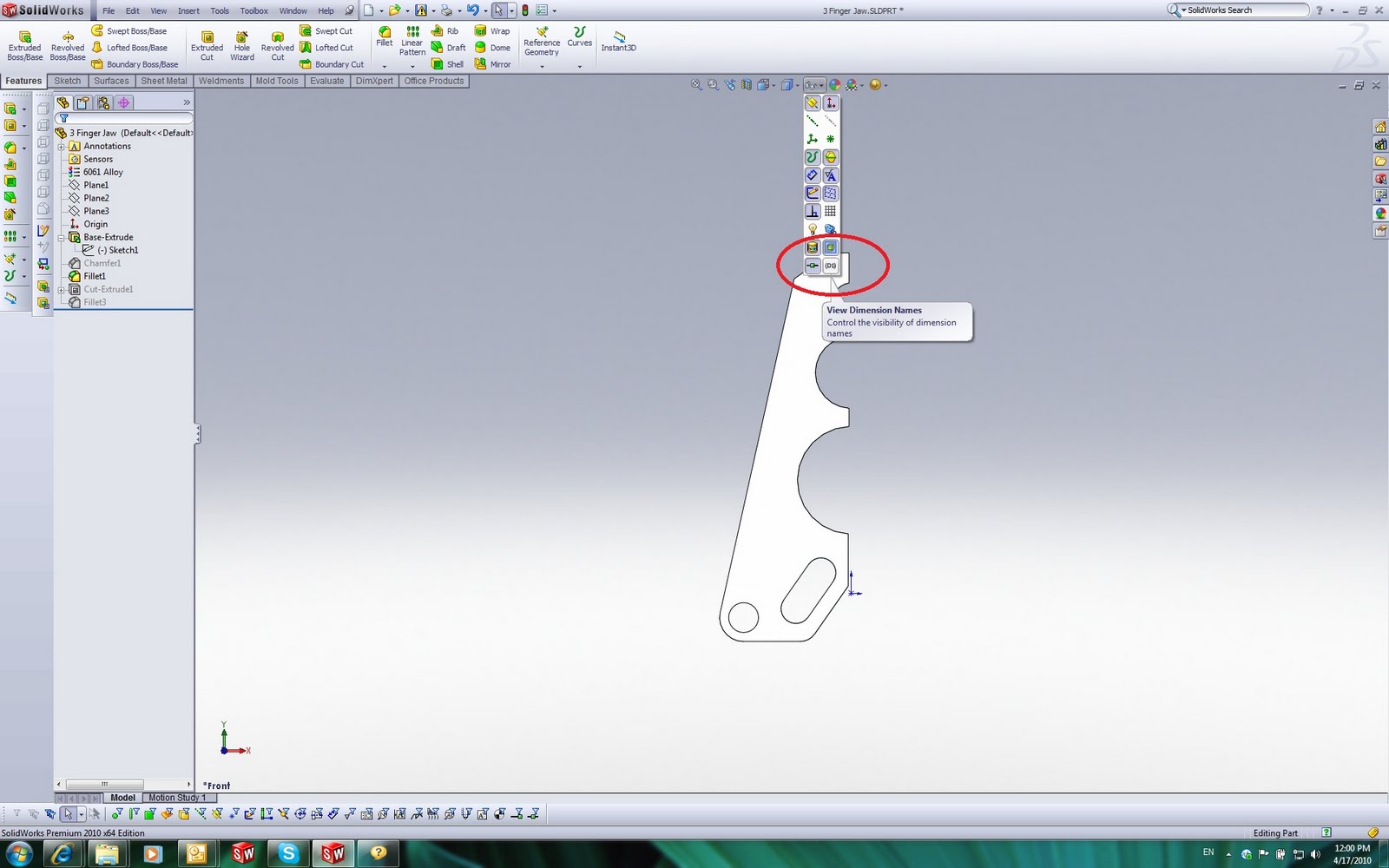 In SolidWorks 2010, you just need to on and off the display under View>Dimension Names, or, from the Heads-up View toolbar, click, Hide/Show Tems>View Dimension Names:
