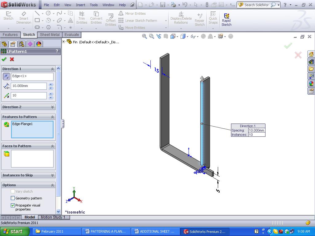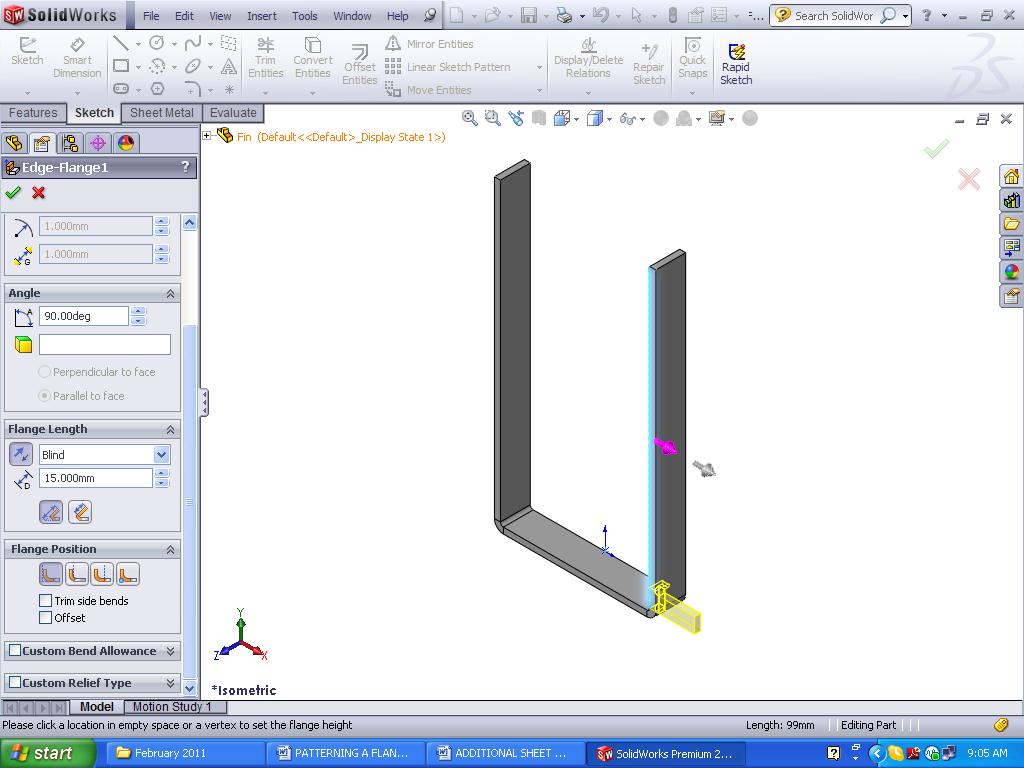 A sheet metal part will always contain the basic flanges such as base/tab, miter and edge. Some of the sheet metal design may need a set of the same geometric flanges. In SolidWorks 2011, these flanges are allowed to be copy instantaneously. Within this tutorial I will show you how to create a flange and pattern it. We will be creating this Fin to learn on how to use these tools.